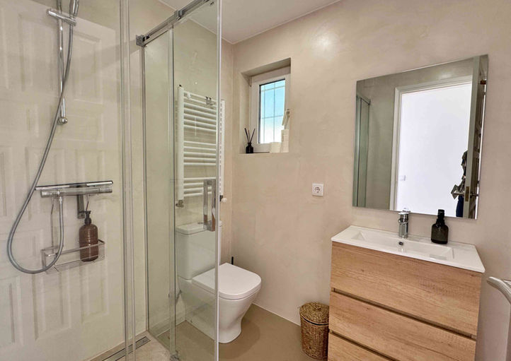 De badkamers van Villa Goyas ademen rust en elegantie. Strakke lijnen, natuurlijke materialen en warme tinten creëren een sfeer van ingetogen luxe. Elke ruimte is uitgerust met een ruime inloopdouche, hoogwaardige afwerking en zachte handdoeken die aanvoelen als een omhelzing.